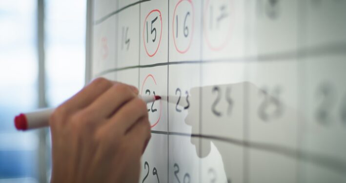 Pessoa marcando datas em um quadro de calendário, em foto que ilustra post sobre primeiros 100 dias de governo. Reprodução: francescosgura/Envato.