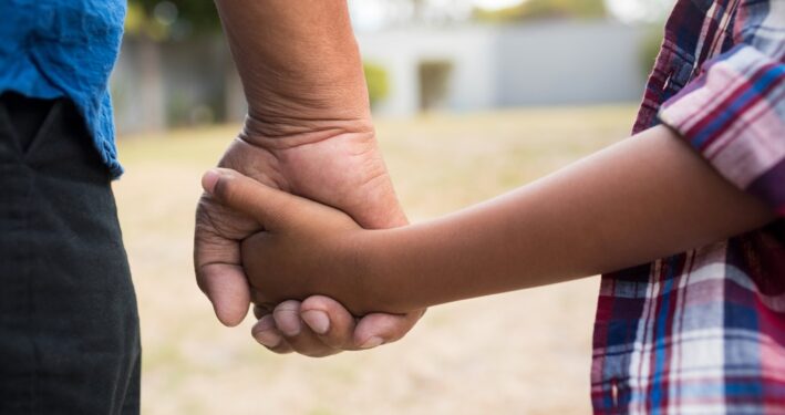 Pai de mãos dadas com filho, em foto que ilustra post sobre primeira infância. Reprodução: Wavebreakmedia/Envato.